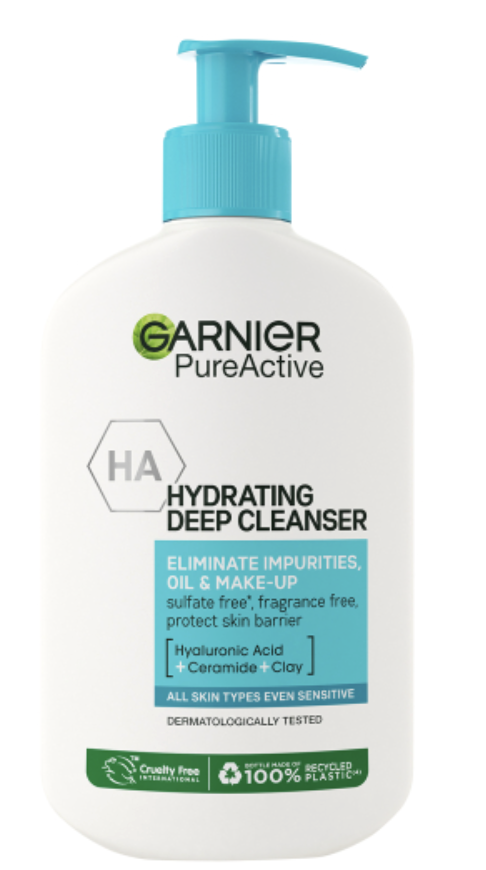 Garnier Pure Active Hydrating Deep Cleanser removes make-up, deeply cleanses residual dirt oil and impurities. This gentle cleansing formula is enriched with Hyaluronic Acid which is known to help lock in moisture and has a hydrating effect.